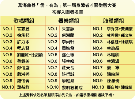 報名影片中有單腳的截肢者翩翩起舞、有聽障者隨著背景音效精準的演出默劇、有視障者演奏樂器傳達美妙音律,也有笑容滿面的唐寶寶擊大鼓、教養院的憨兒們跳起動感啦啦隊、講話吃力的腦性麻痺朋友唱出動人歌曲;連續兩週的時間,萬海慈善身障者才藝徵選活動的初選評審委員,仔細端詳每位報名者的自述簡介,細細品味每支表演影片呈現出的生命勇氣,最後從眾多報名者中依表演的流暢性、技巧性、台風、散發的舞台魅力,以及每位參賽者其障礙狀況之於表演的困難程度所帶出的感人奮鬥故事,由「器樂」「歌唱」「肢體表演」三類徵選項目中各選出10組入圍決賽。